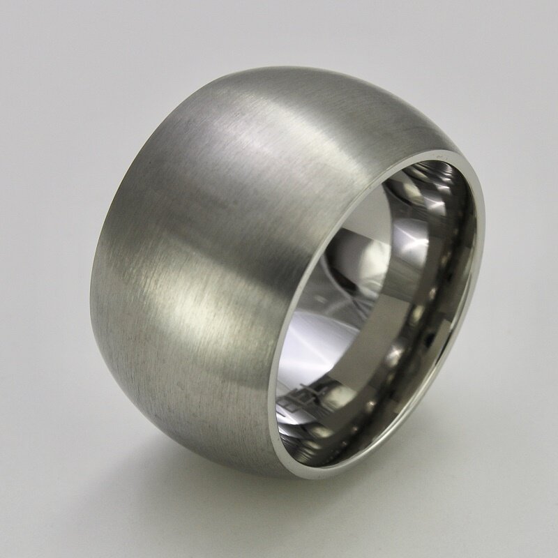 Dies ist ein breiter und auffälliger Ring aus Edelstahl mit edel mattierter Oberfläche.