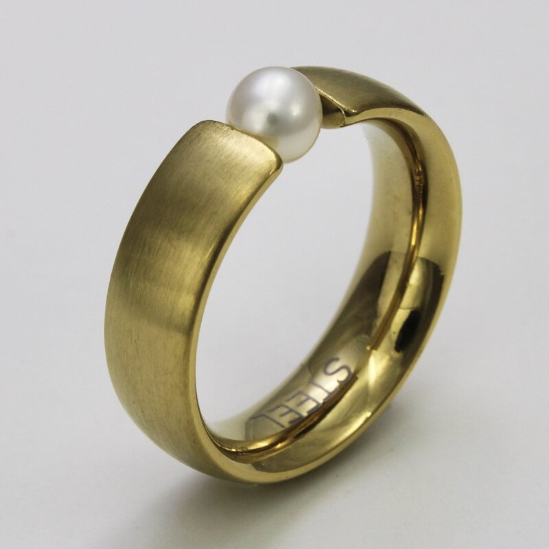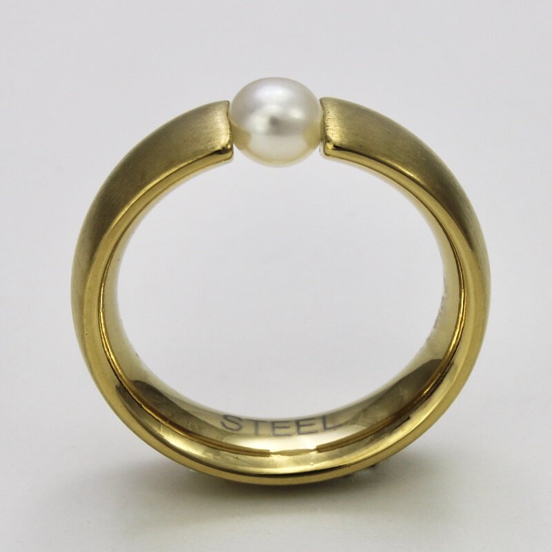Dies ist ein eleganter Ring mit PVD vergoldetem (Ionenplattierung) Edelstahl, mit fein mattierter Oberfläche. Eingespannt in diesem Ring ist eine weiße Zuchtperle.